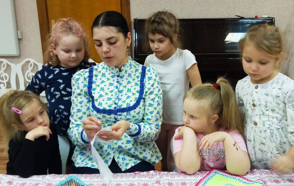 Девочкам особенно понравилась возможность самим пробовать вышивать узоры на маленьких лоскутках ткани. Они с увлечением и невероятным старанием выполняли стежок за стежком.