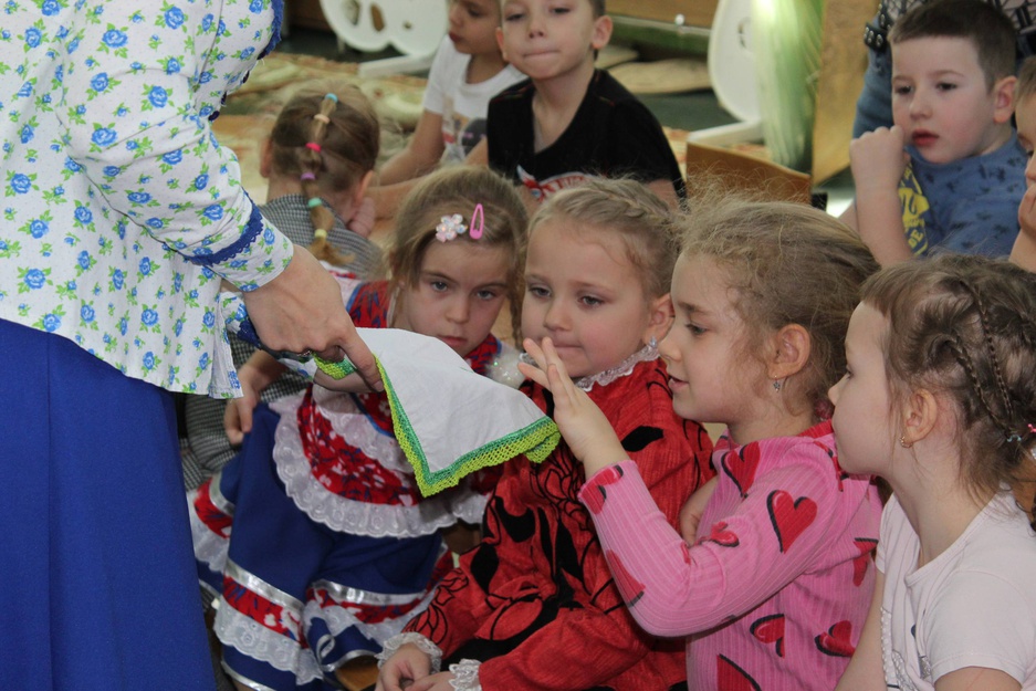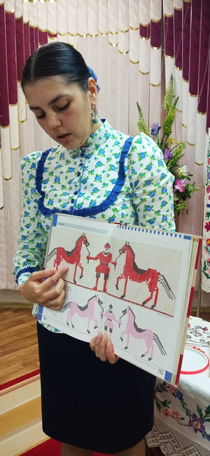 Воспитанники с огромным интересом рассматривали узоры вышивки и словно завороженные, слушали рассказ нашей гостьи, о том, как назывался каждый стежок, какой узор и для чего создавался.