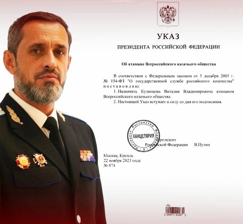 На этом занятии подрастающие казачата узнали, что атаманом Всероссийского казачьего общества является казачий генерал Виталий Кузнецов. Он был назначен на эту должность 22 ноября 2023 года Указом президента Российской федерации Владимиром Владимировичем Путиным.