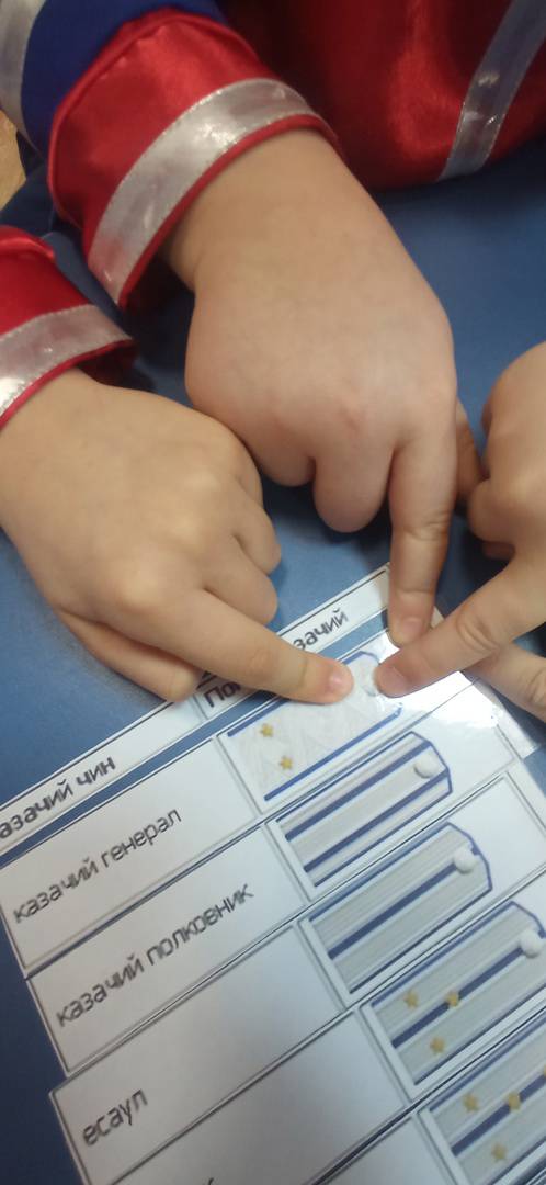 Рассматривая погоны, ребята узнали, что Всероссийский атаман имеет чин казачьего генерала, который является высшим среди казаков. Так же ребята узнали, как называются и другие чины, как выглядят погоны, соответствующие каждому чину.